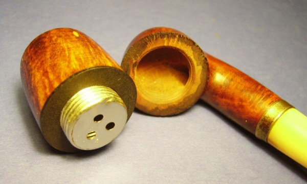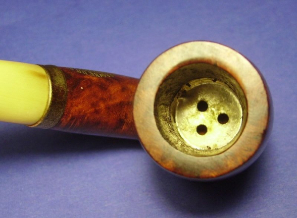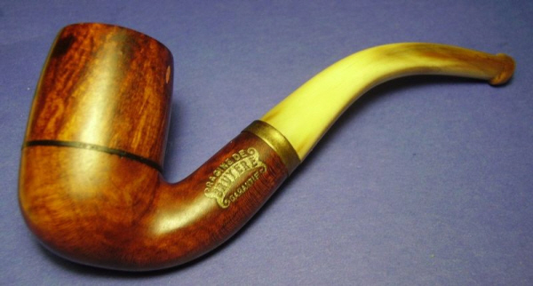I suspect we do not currently know the name of this pipe since Racine is the French for root. The stamping on the side of the pipe is Racine, Bruyere Garantie The mouthpiece is of horn, the pipe and bowl are briar. The threaded base of the bowl is metal Measurements: L: 13 cm, H: 5 cm, W: 3 cm (1 inch= 2,54cm) |